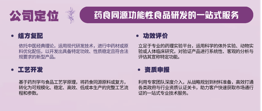 公司主营业务包括:基于中医经典理论的复方优化配伍产品开发,基于药剂学与食品工艺学原理进行产品工艺开发,基于专业的药理实验平台进行产品功效评价,基于专家团队推动资质认证申报服务。目前公司围绕着紫苏已成功开发出抗衰老产品、降糖产品、解酒产品、功能性茶饮等多个系列产品。